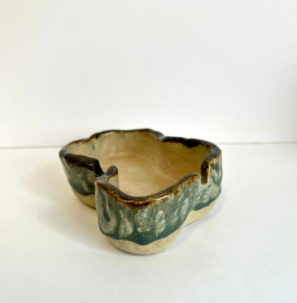 Peça única modelada à mão em argila clara. A esmaltação em tons de verde e preto cria um contraste orgânico e profundo, destacando o contorno irregular da forma. A superfície revela nuances da argila natural, evidenciando o processo manual e a textura bruta do material.