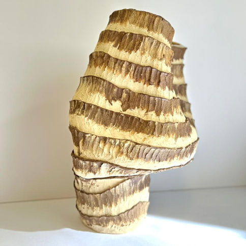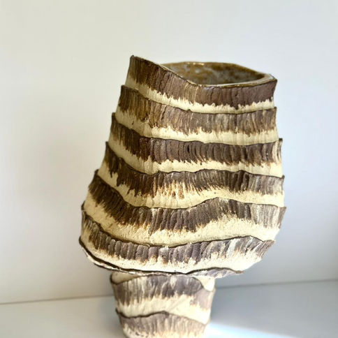 Peça feita manualmente em alta temperatura, utilizando a mistura de duas argilas — branca e preta — que se alternam em camadas orgânicas. A parte interna recebe esmaltação branca e transparente, criando contraste com a superfície crua e texturizada do exterior.